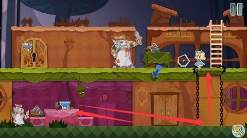 8、将黄色场景向右拖动让变小药水和变大蛋糕重叠在一起,使用钥匙开门后扑克兵会喝下变小药水变成最小。