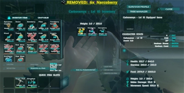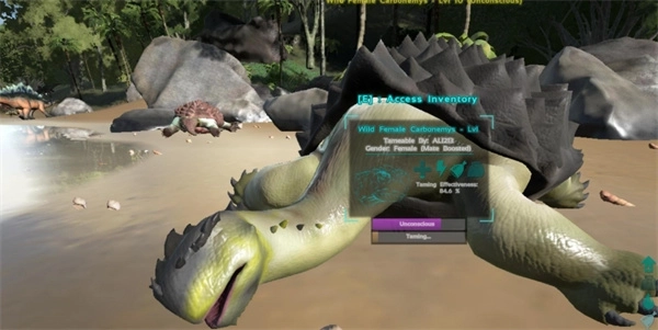 5、当恐龙陷入昏迷状态时,其头部会出现紫色进度条。此时按下【E】键打开背包,放入食物供其进食,但要注意负重限制。