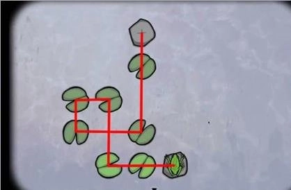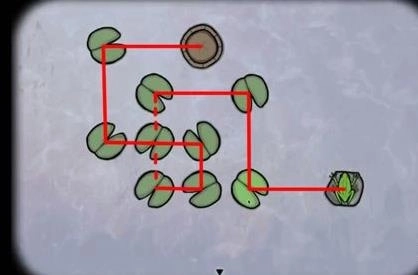 1、调查青蛙,然后控制青蛙跳过每一片荷叶落到石头上,5次以后得到第一只青蛙;