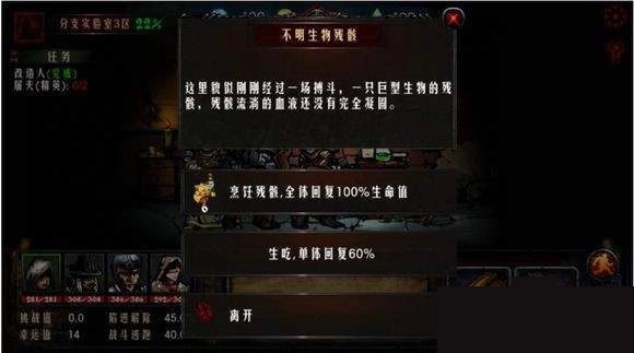 1、进入地牢初期若发现地上有动物尸体,建议优先选择恢复60%生命值,性价比极高;若后续资源充足,可用6份食物为全队回复满血;若当前状态良好,也可暂时跳过,留待后续回血使用。