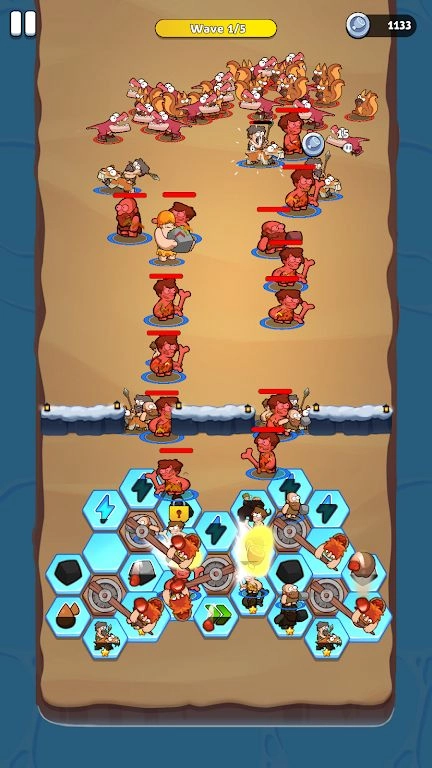 3、组合近战、远程单位与强力原始人构建多样战斗编队,依据战场态势灵活调配出战阵容。