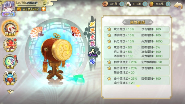战鼓能对全体战姬产生全方位加成效果,涵盖攻击、防御、生命值、命中率、闪避、暴击与韧性等属性。随着战姬等级提升,百分比加成的效果也会愈发显著。