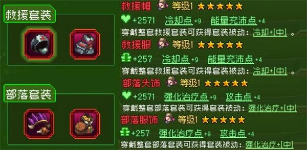 穿戴整套【部落套装】,能获取“强化治疗+【中】”的效果,该效果可中等幅度提升友方队友的攻击力。若搭配群奶武器使用,队友全程基本都会处于攻击力增幅状态,通关也会更轻松。