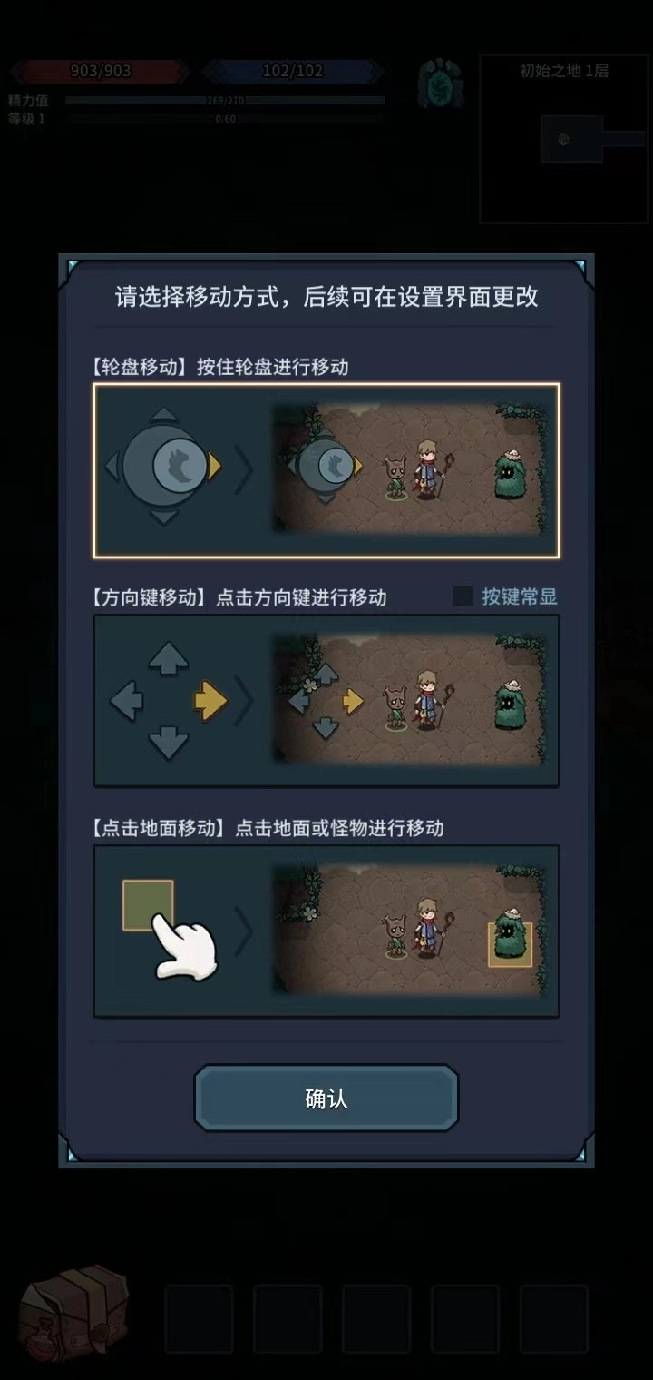4、接下来要选择一种移动方式,通常情况下会默认选中第一种,要是玩家觉得用起来不习惯,也能在设置界面里进行调整。