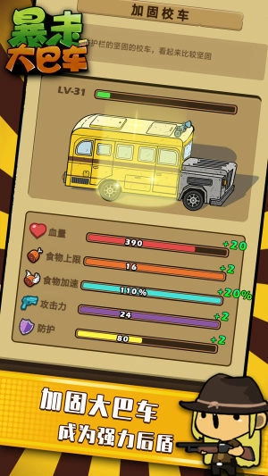 在游戏全程,玩家需守护自己的大巴车,并且要把所有僵尸都清除掉。招募更多英雄,组建专属小队,去挑战难度逐步提升的关卡。升级角色能力会消耗金币,以此增强玩家的实力,从而有效降低闯关的难度。玩家持续闯关,还能解锁各类建筑,为自己带来更丰厚的收益。