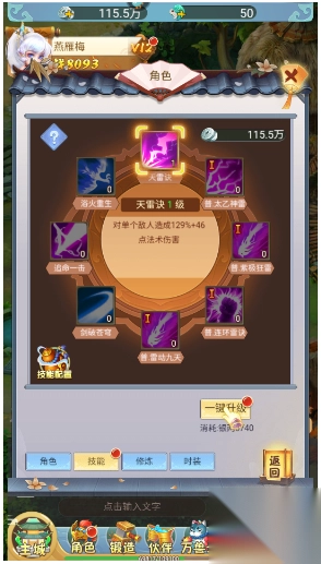 5、点开角色,还可以学习技能,点击一键升级即可,可以大大增强战斗力;